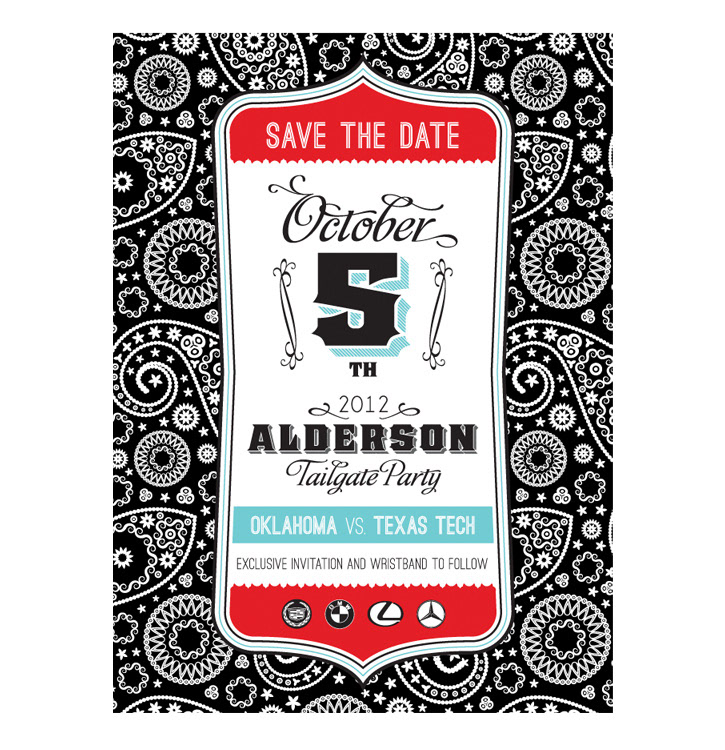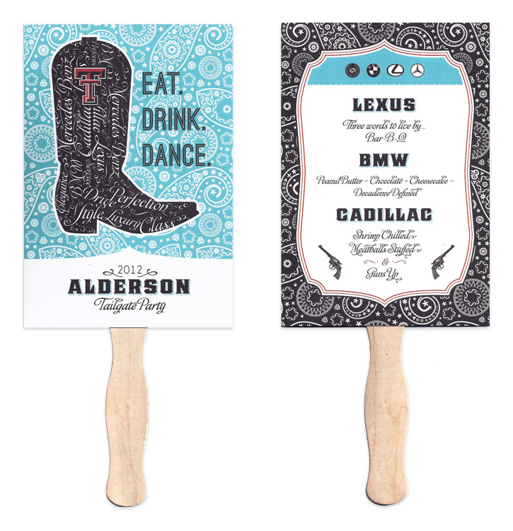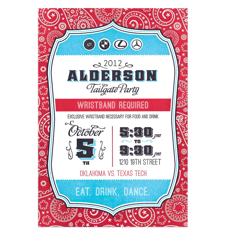 Letterpressed invitation collateral for annual Alderson Tailgate party Credits: Agency: Aycock Mediaworks Designer: Armando Godinez Jr.