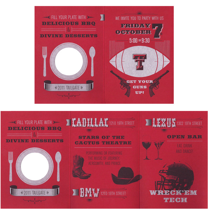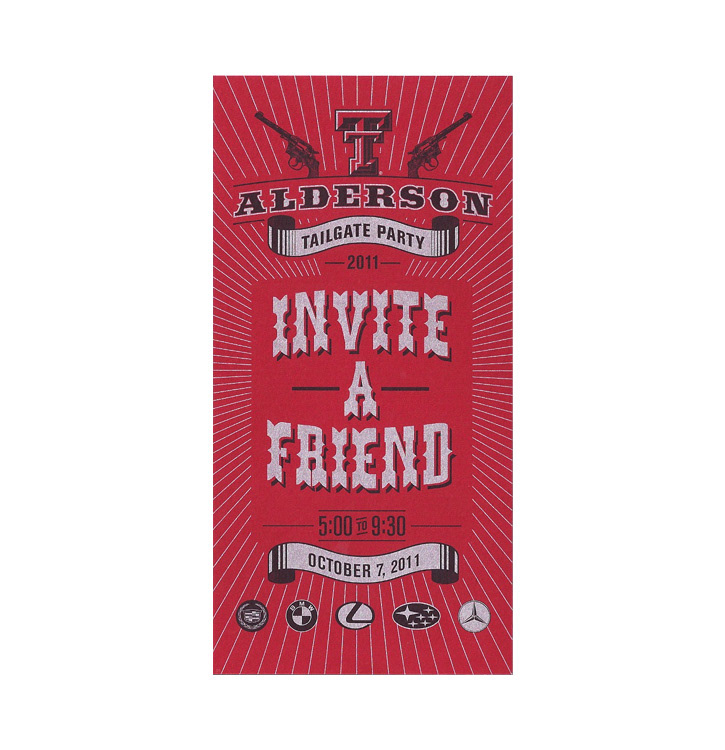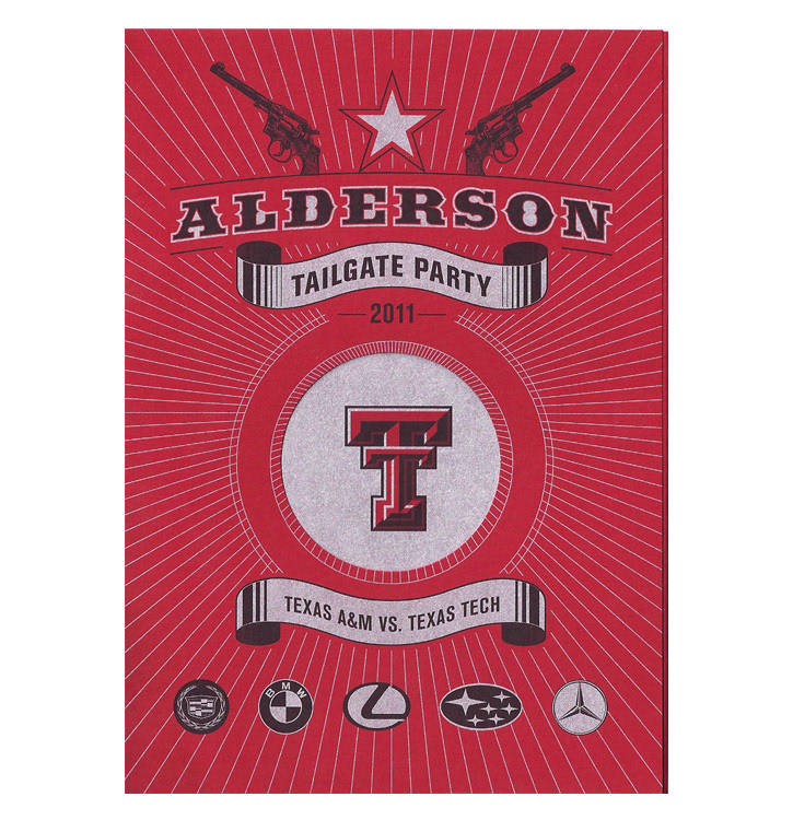 Design for Alderson Auto Group's annual customer appreciation tailgate party. The printing of this consisted of French Pop-Tone paper with a spot black and spot metallic. Credits: Agency: Aycock Mediaworks Designer: Armando Godinez Jr.