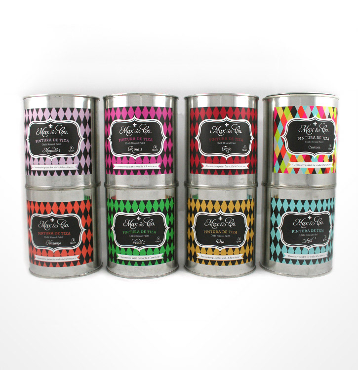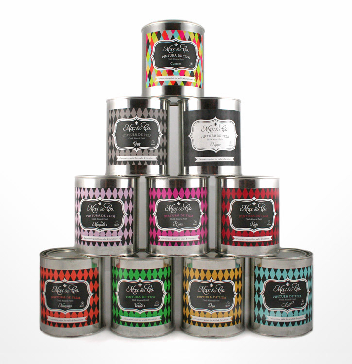 New packaging design for a chalk mineral paint product from Max & Co. that comes in 20 different colors plus custom mixes.